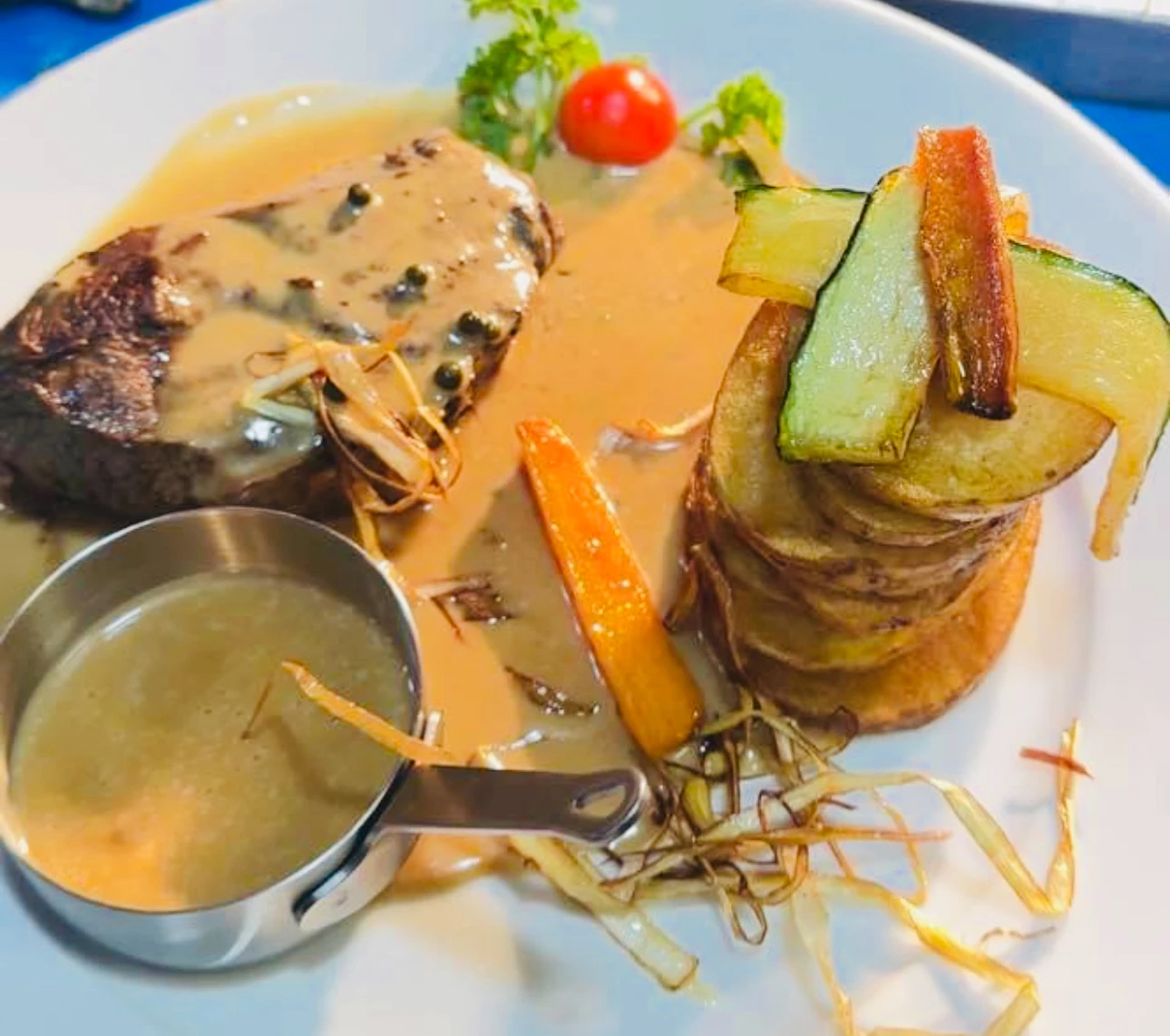 9oz Fillet steak cooked in creamy peppercorn