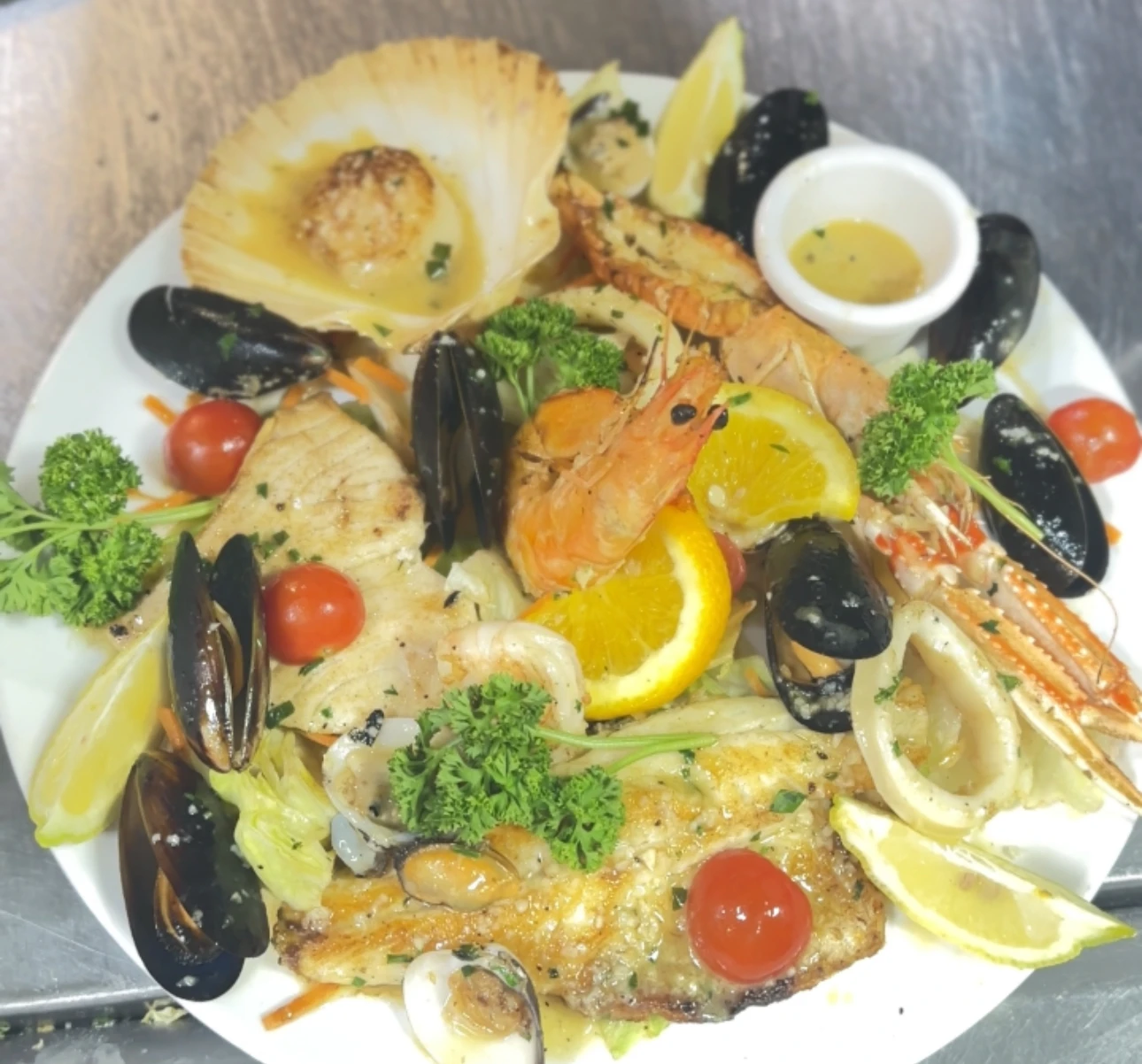 Spaghetti cooked with ,clams, tiger prawns, calamari, mussels , parsley, garlic cherry tomatoes, in cream sauce